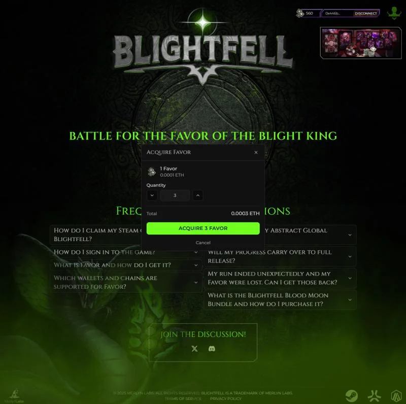 Blightfell is a blockchain-integrated strategy autobattler by Merlyn Labs. As Lead Integrations Engineer contracted through Ball Lightning AB, I owned the entire Favor system — the in-game currency that bridges on-chain purchases to gameplay. The work spans from the purchase UX on Blightfell.com through backend verification, ledger accounting, and Unity server-to-server endpoints.